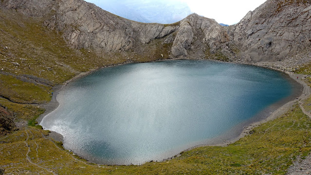 El valle "soleado" que se ve a la izquierda ya es Francia, desde que hemos bordeado el ibón vamos por la linea imaginaria de la frontera.